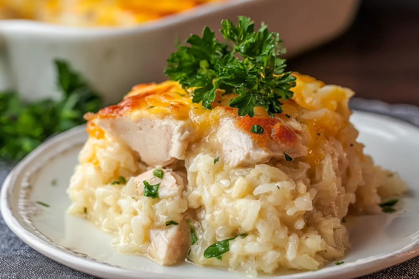 Pour the creamy sauce over the chicken and rice. Finally, add a few dots of butter on top before covering the dish with foil. Bake for 1 hour, then remove the cover, sprinkle with freshly grated Parmesan cheese, and bake for an additional 10 minutes, until golden. For more chicken recipes, check out this Crock-Pot Angel Chicken recipe for a comforting twist!