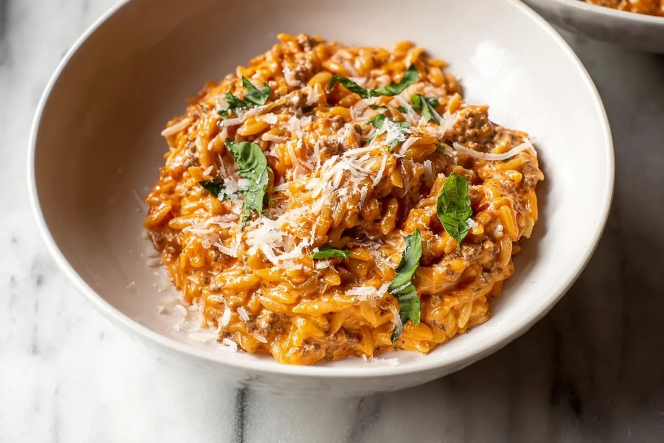 Moreover, this easy recipe is perfect for busy weeknights, as it comes together in no time. Its creamy consistency and robust flavors guarantee satisfaction in every bite. Whether you’re cooking for your family or hosting friends, Ground Beef Orzo with Tomato Cream Sauce is sure to impress and become a beloved staple in your kitchen.