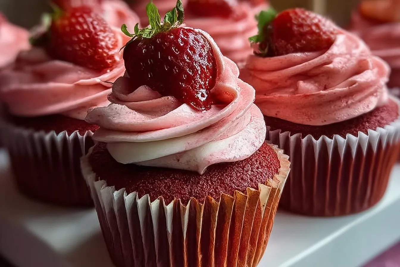Keywords: Red Velvet, Cupcakes, Pink Buttercream, Strawberry, Dessert