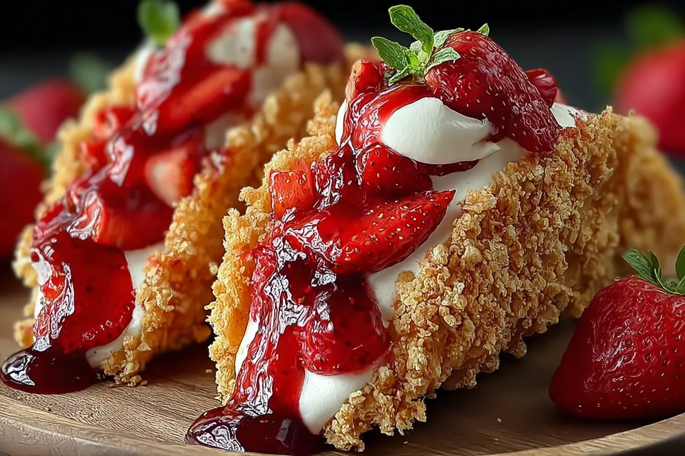 Strawberry Crunch Cheesecake Tacos are a delightful twist on traditional cheesecake, combining creamy cheesecake filling with a crunchy taco shell and fresh strawberries.