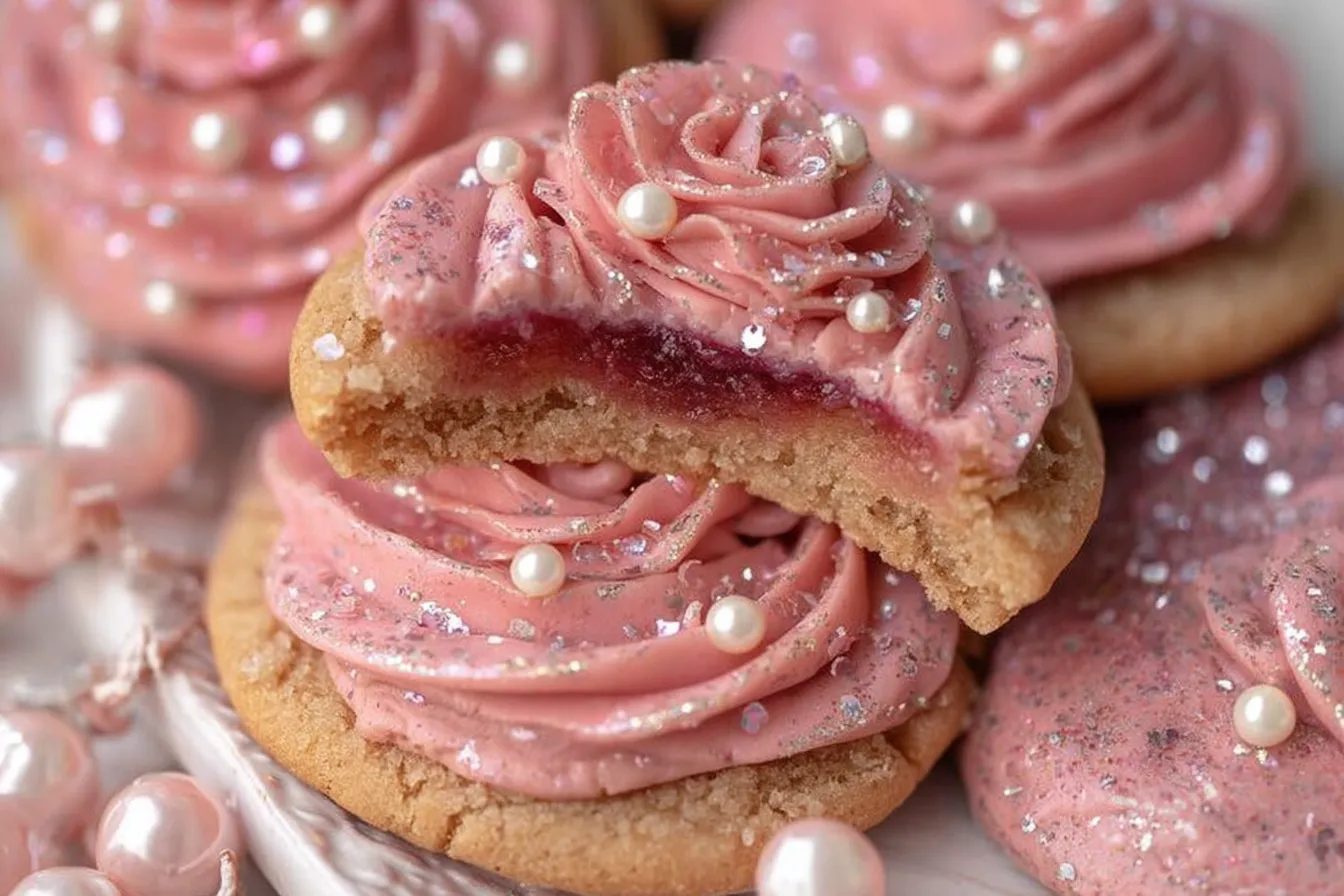 For the creamy icing, blend freeze-dried berries with softened butter and salt. Mix in plum jam and powdered sugar, adjusting with heavy cream for consistency. Finally, top the cooled cookies with this luscious frosting and scatter some pink sprinkles for an added pop!